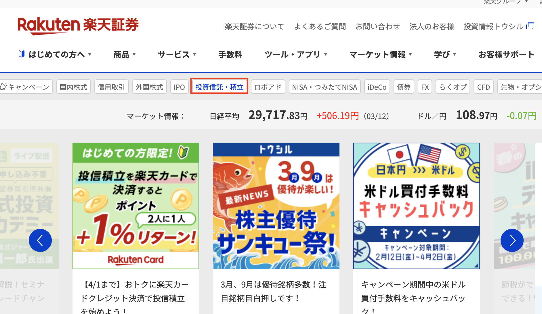 楽天証券のトップページの「投資信託・積立」をクリックし、